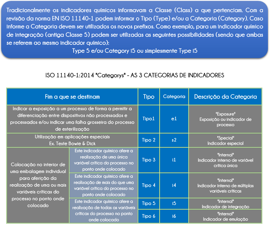 A norma EN ISO 11140-1:2014 que substitui a antiga EN ISO 11140-1:2005, especifica os requisitos gerais e os métodos de teste para indicadores que demonstram, por meio de alteração física e/ou química de substâncias, a exposição a processos de esterilização, e que são utilizados para monitorar o alcance de um ou mais parâmetros do processo, específicos de um processo de esterilização. A sua ação não está dependente da presença ou ausência de organismos vivos.